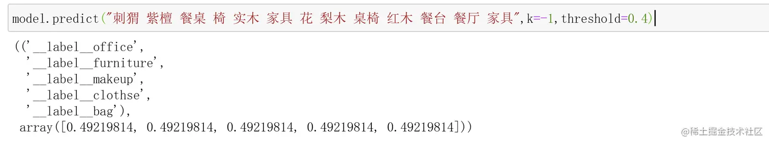 model.predict("刺猬 紫檀 餐桌 椅 实木 家具 花 梨木 桌椅 红木 餐台 餐厅 家具",k=-1,threshold=0.4)