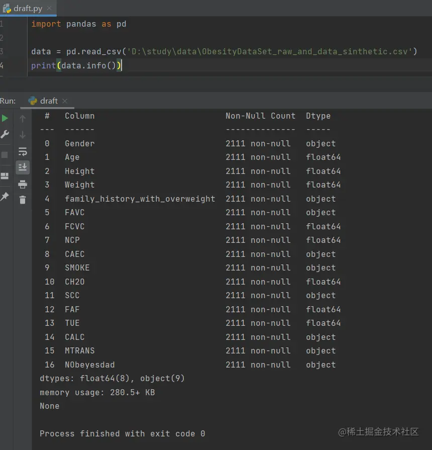 通过这些指标,可以对此数据集做一个初步的判断。比如:字段Gender中,Male 的人数达到1068人,而总人数为2111人,因此可以初步判断男女的数量较为平均;字段family_history_with_overweight 中,回答为yes的人数达到1726人,由于总人数为2111人,因此可以初步判断大部分的人都有家族肥胖历史。