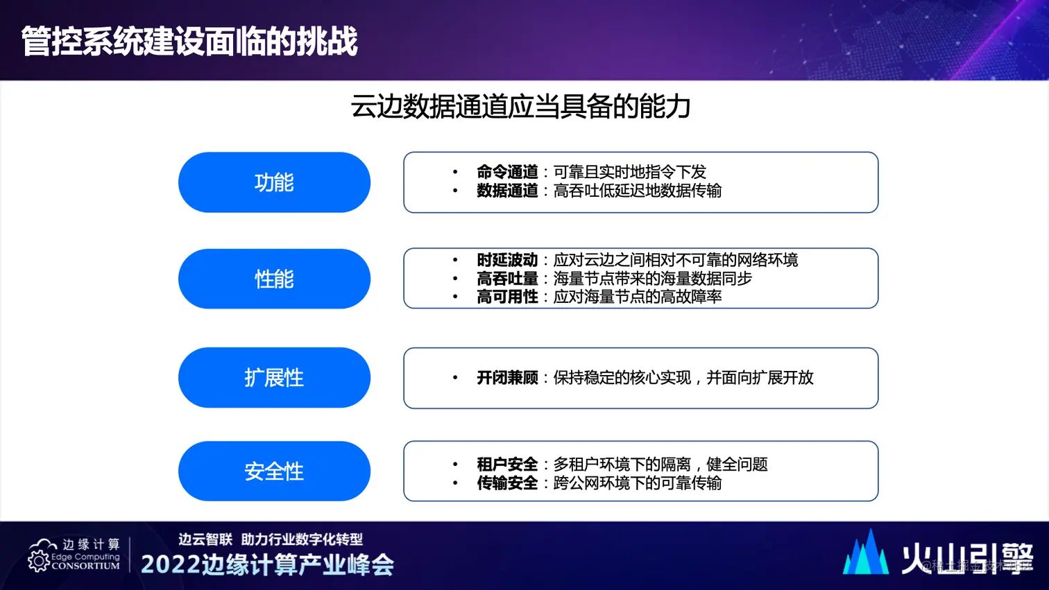 另一方面,随着边缘原生的兴起,云与边之间的协同控制被作为基础能力会更加受到关注。我们在启动边缘计算业务的时候也已经意识到这一点,我们觉得云边通道是一个值得独立讨论和深入研究的问题。因此我们在云边通道方面投入了力量,并努力为他补全工业级场景所匹配的配套能力,希望他能够发挥足够的作用。