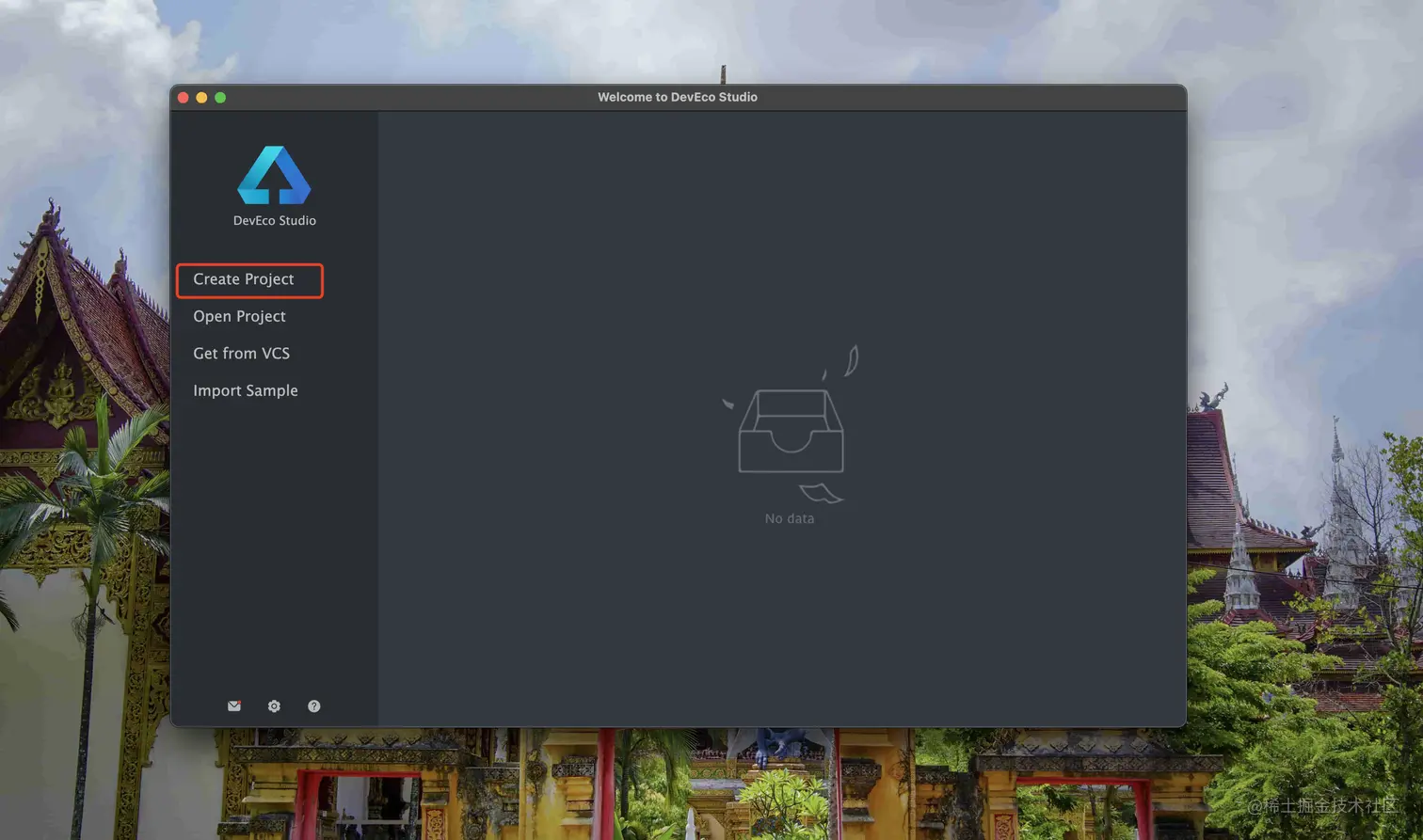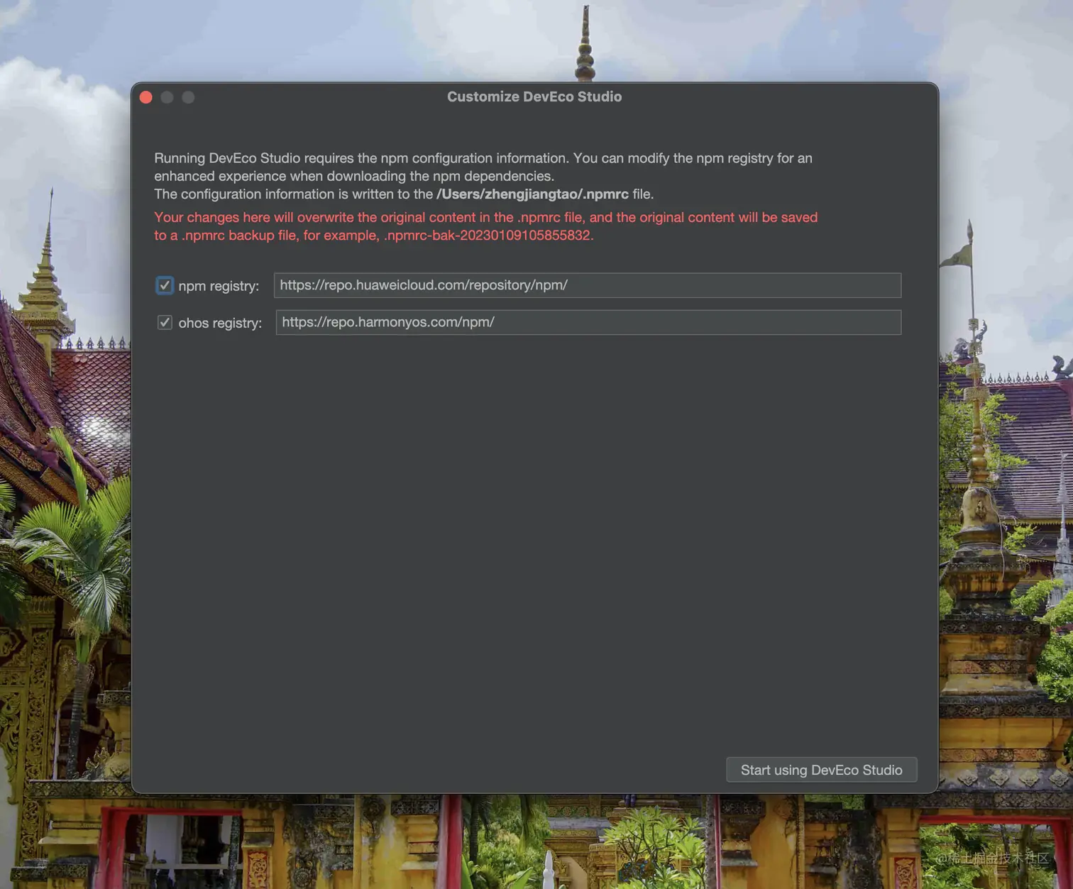 由于神秘力量的原因,官网的npm源很慢,那我们给它换成华为的源。然后请点击“Start using DevEco Studio”