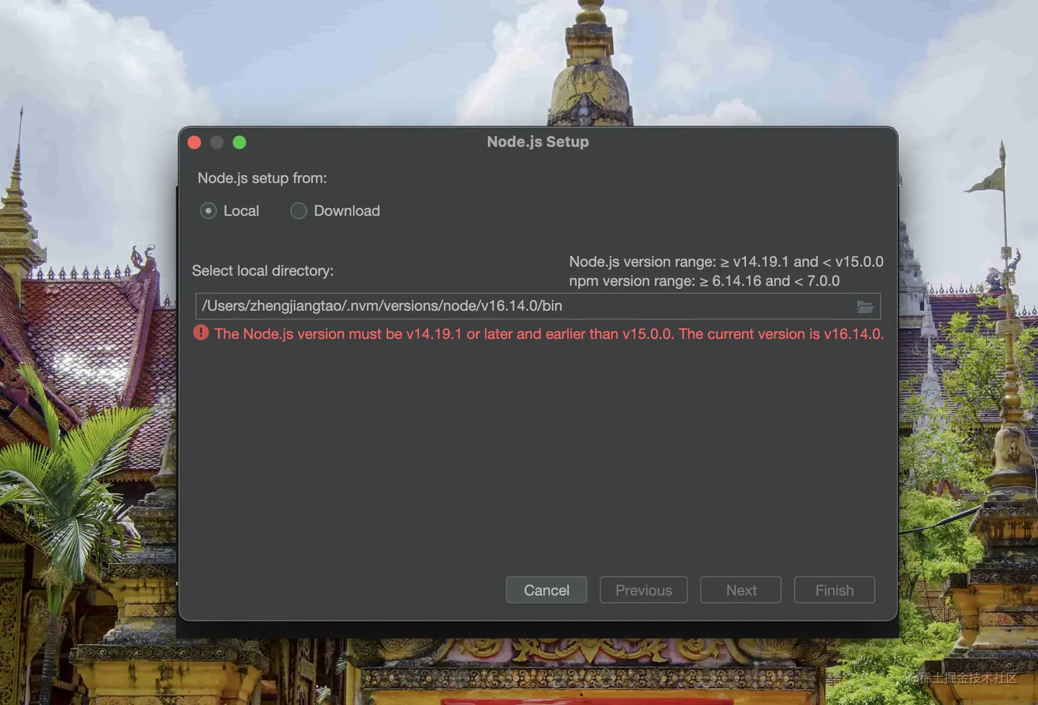 因为我之前装了nvm,所以我这里选择本地,这里你可以关注下红色那句话,对node是有版本要求的,不能太高,也不能太低哦。