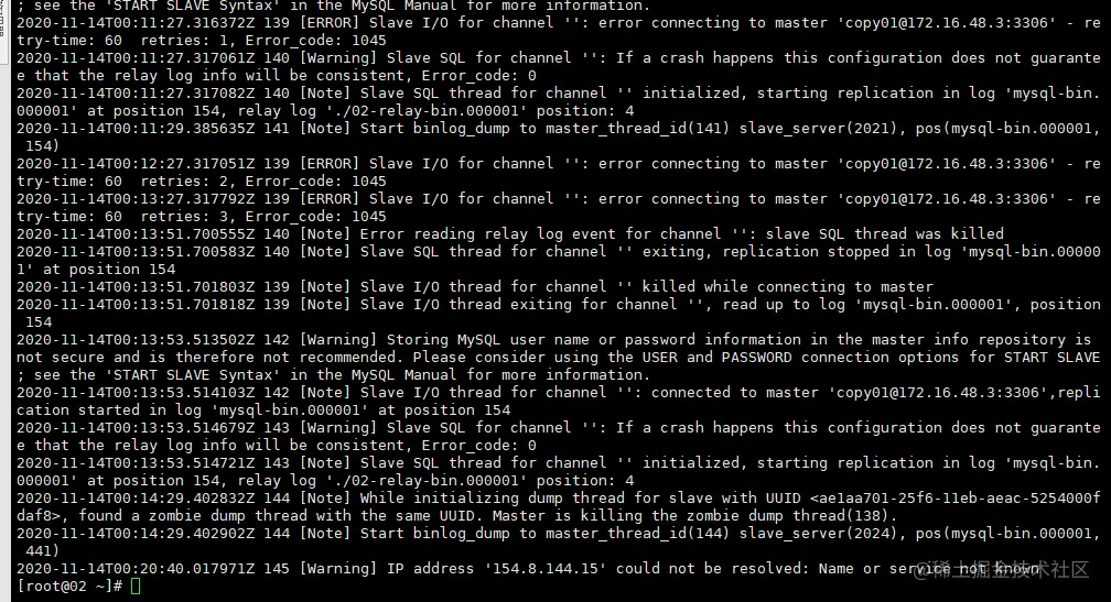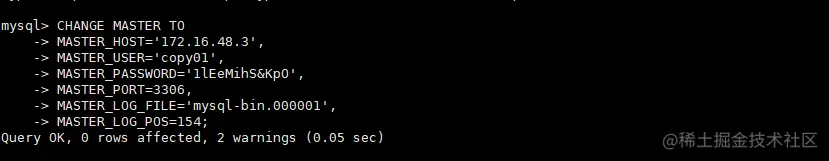 CHANGE MASTER TO MASTER_HOST='172.16.48.16', MASTER_USER='copy02', MASTER_PASSWORD='(Fk(k3(%_euu', MASTER_PORT=3306, MASTER_LOG_FILE='mysql-bin.000001', MASTER_LOG_POS=154;