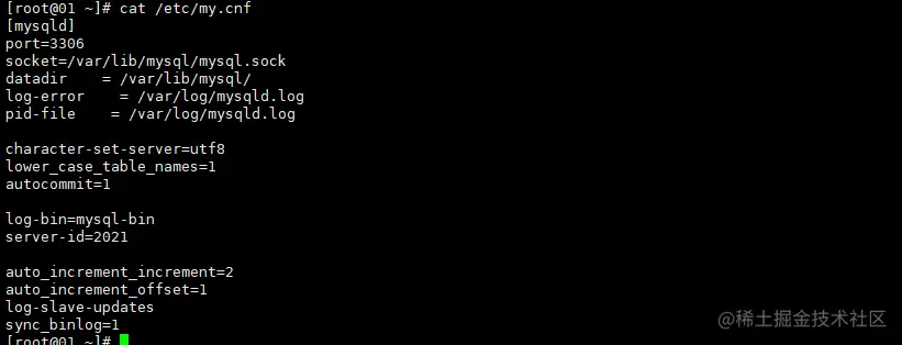 [mysqld] port=3306 socket=/var/lib/mysql/mysql.sock datadir=/var/lib/mysql/ log-error=/var/log/mysqld.log pid-file=/var/log/mysqld.log character-set-server=utf8 lower_case_table_names=1 autocommit=1 log-bin=mysql-bin server-id=2021 auto_increment_increment=2 auto_increment_offset=1 log-slave-updates sync_binlog=1