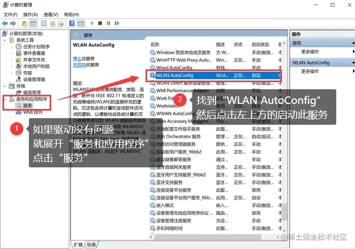 3、如果驱动程序没有问题,就展开【服务和应用程序】,单击【服务】。找到【WLAN自动配置】,单击左上角的【启动此服务】。