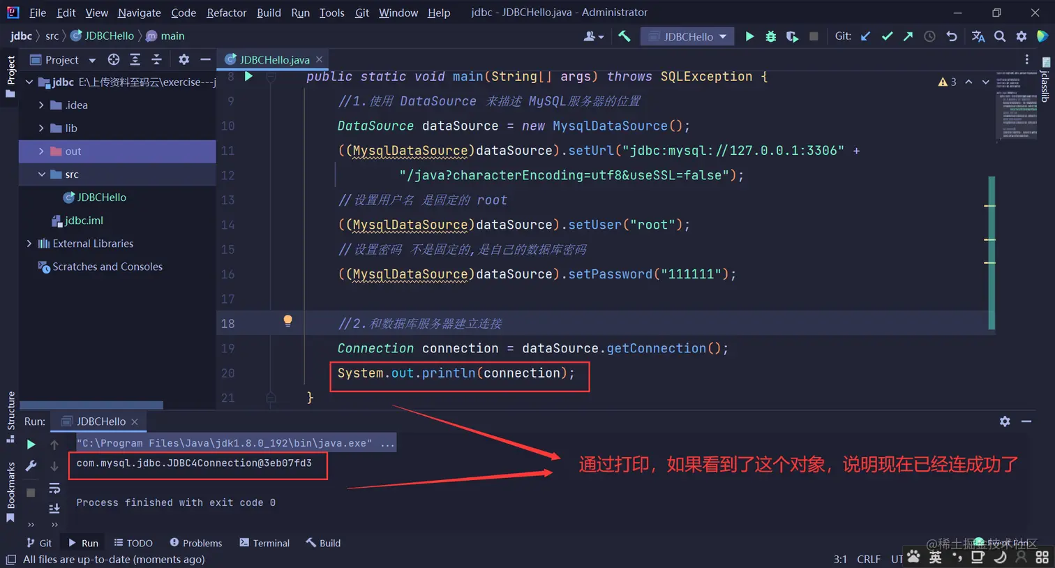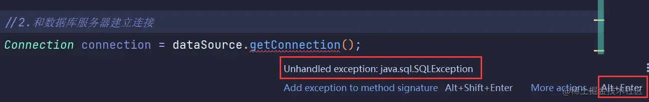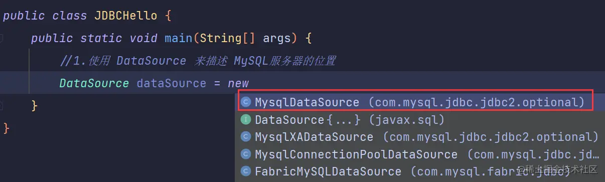DataSource dataSource = new MysqlDataSource(); --DataSource 是一个 interface,不能直接实例化~~ --而 MysqlDataSource 则是实现了 DataSource接口~~ --实际上,这个操作,就是 "向上转型"~~注意: 这个类来自于驱动包,如果驱动包导入正确,才能够顺利的提示出来;