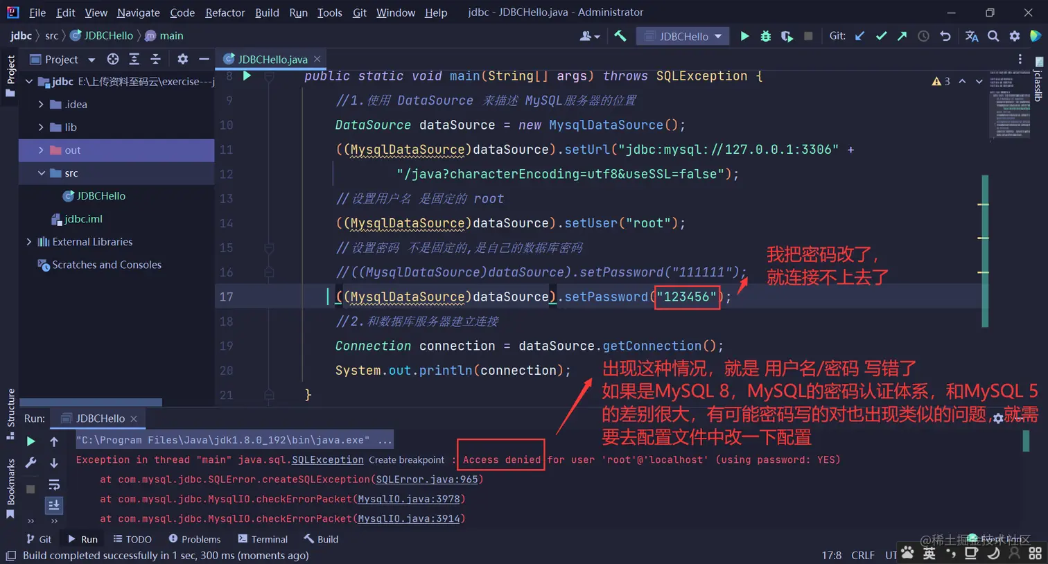 //设置用户名 是固定的 root ((MysqlDataSource)dataSource).setUser("root"); //设置密码 不是固定的,是自己的数据库密码 ((MysqlDataSource)dataSource).setPassword("111111");以上操作,就可以准确的描述服务器的位置