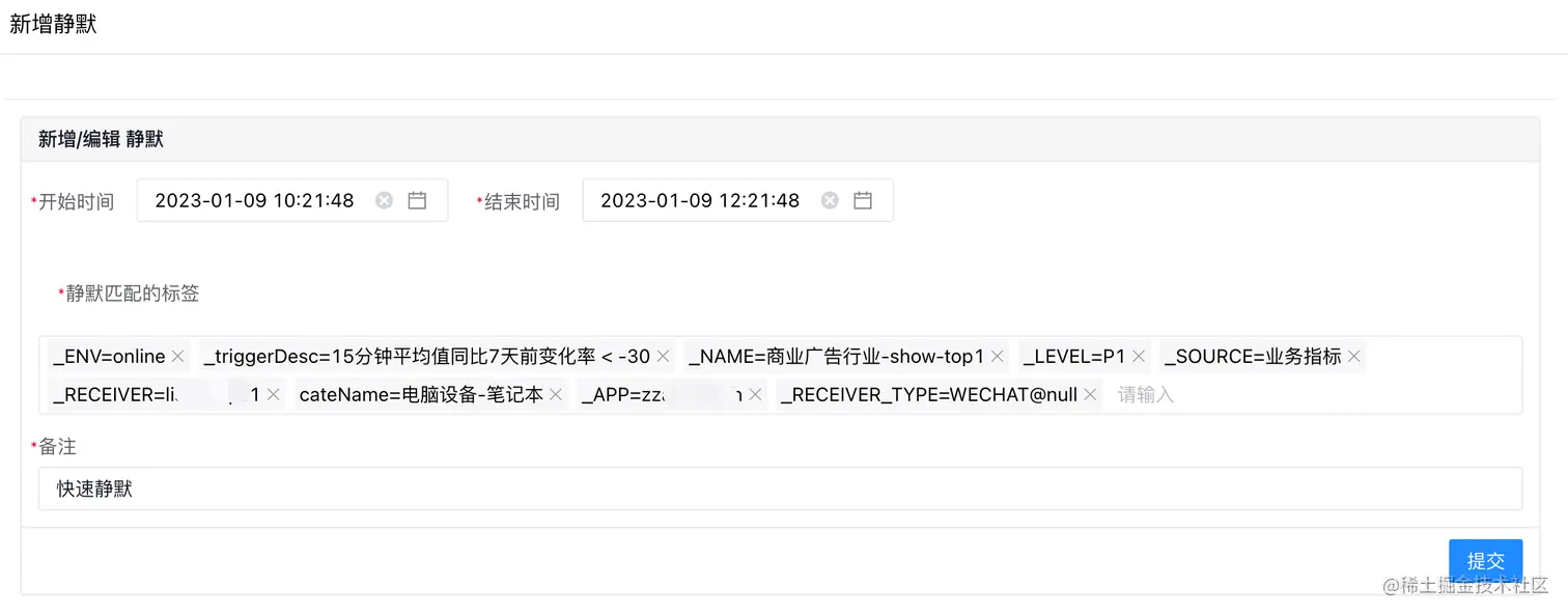 点击新增静默后,会自动补充静默匹配的标签项,也可以增减标签项,如:去掉INSTANCE标签维度以便匹配所有的机器,修改_RECEIVER为其他人等。需要注意的是,添加静默时RECEIVER必须要指定。
