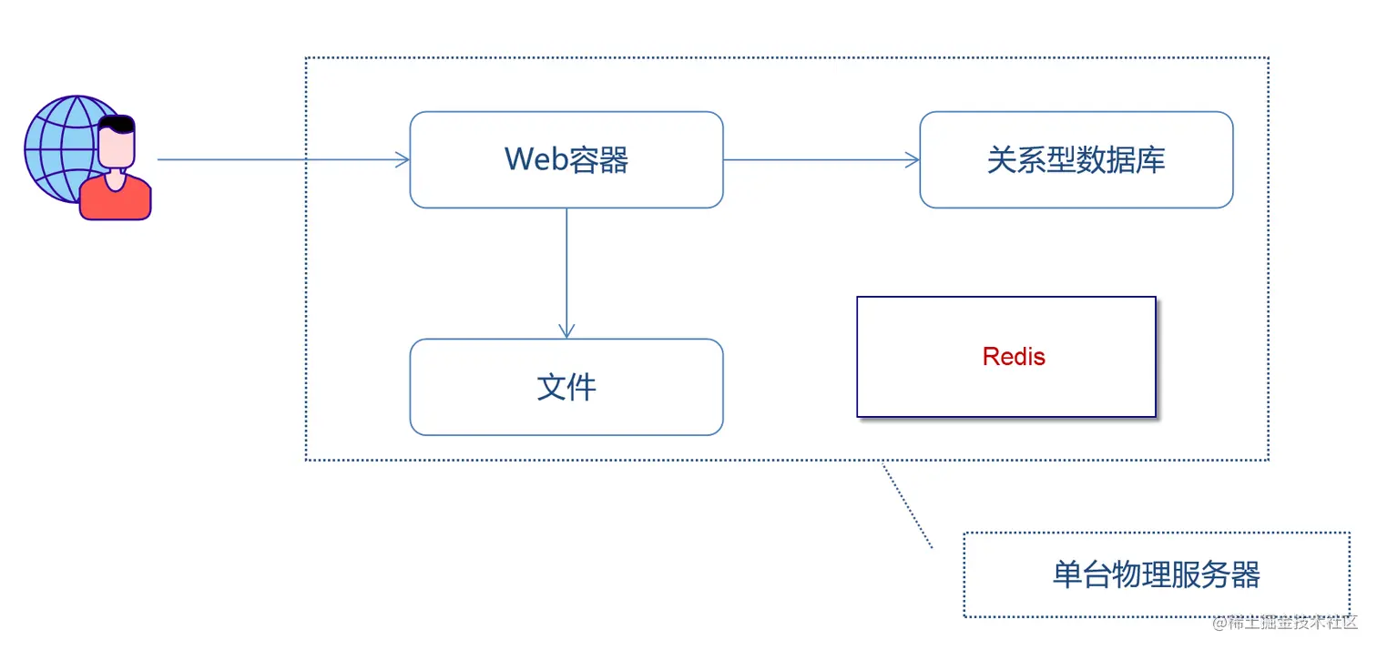 那一个老架构师和菜鸟架构师有什么差距呢?其实这就体现在内功上了,我再举个例子,像刚才的单体架构,随着业务的发展已经不堪重负,到了该架构升级的时候了,新人会想这好办啊,分析后目前架构的瓶颈发现是大量文件文件的读写影响到数据库存储的IO,导致数据库查询出现高延迟,这是新人可能会想到在服务器内额外部署Redis缓存,将数据库中的数据载入到Redis中,对于无事务处理直接在Redis中完成,阻止其缓存穿透到MySQL层面,问题就能得到解决。