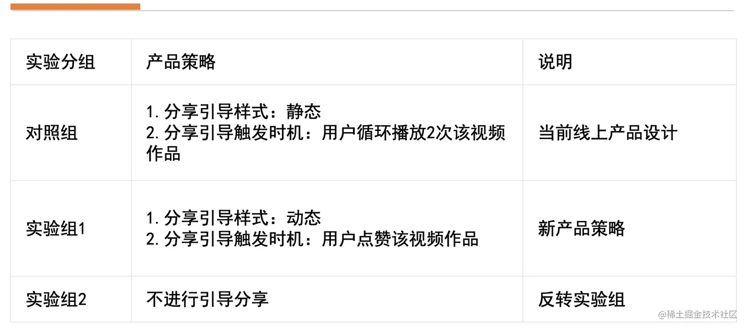 在完成了分享引导新功能的设计后,该产品团队基于想要验证的目标,在DataTester上设计了实验分组。实验设计在原有的旧产品策略、新产品策略之外,还额外增加了一个“反转实验组”,该实验组是要验证分享策略是否对用户体验有负向影响。