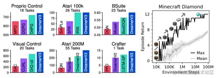 工程师在超过 150 个固定参数的任务上对 DreamerV3 进行了测试,并与文献中记载的最佳方法进行比较,实验表明,DreamerV3 对于不同 domain 的任务,均具备较高通用性和可扩展性。