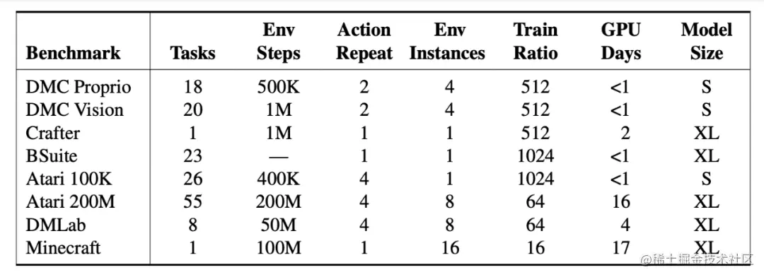 这些 domain 包括连续动作 (continuous action) 和离散动作 (discrete action),视觉输入和低维输入,2D 世界和 3D 世界,不同的数据预算、奖励频率和奖励尺度等。