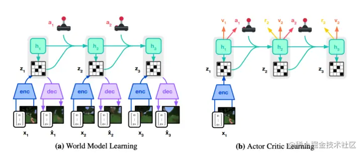 actor 和 critic 从 world model 预测的抽象表征 trajectory 中学习。