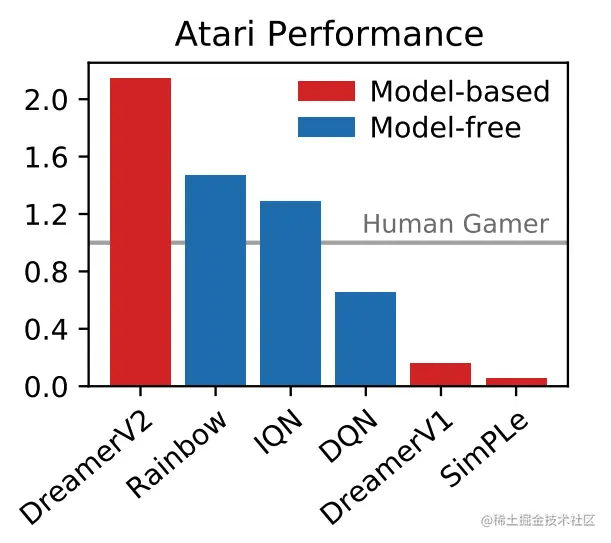 DreamerV2 是第一个通过在单独训练的 world model 中学习行为,在 Atari 基准的 55 项任务中达到人类水平的 agent。在相同的计算预算和 wall-clock time 情况下,DreamerV2 达到了 2 亿帧,超过了顶级 single-GPU agents IQN 及 Rainbow 的最终性能。
