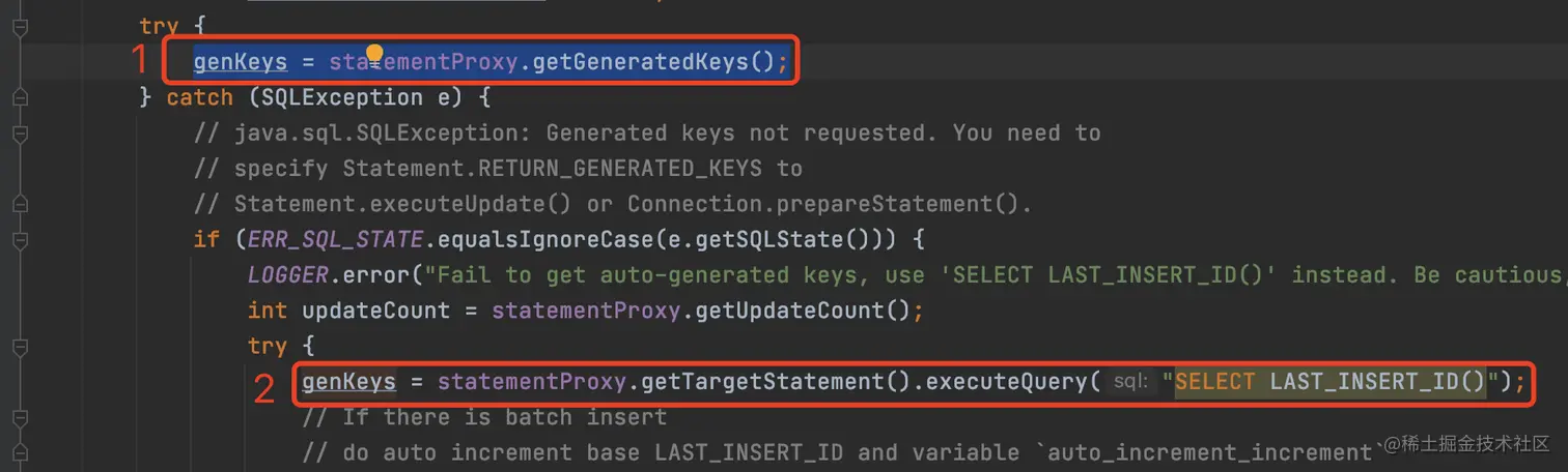 statementProxy.getGeneratedKeys();执行报错,才进入了executeQuery("SELECT LAST_INSERT_ID()")导致了报错,那么: