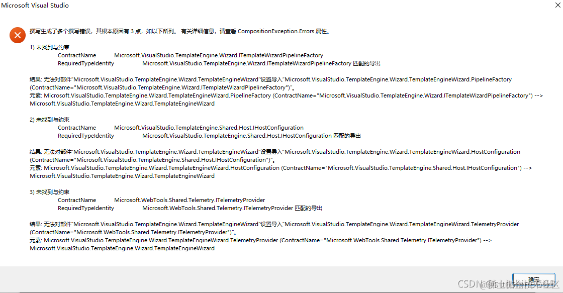 VS 撰写生成了多个撰写错误,其根本原因有X点,如下所列。有关详细信息,请查看CompositionException.Error属性 GoodTime 2023-01-13 66 阅读1分钟 打开VS开发程序,莫名其妙的出现如下图错误: 网上找了很多资料,有前辈说以下方法: 解决方案如下 打开文件夹 Users\<CurrentUser>\AppData\Local\Microsoft\VisualStudio\<version>\ 删除文件夹 ComponentModelCache 重启 Visual Studio. 但是我试了好像没有用,最终解决办法: 完全卸载VS,下载重新安装即可,修复也没效果,卸载重装才行。