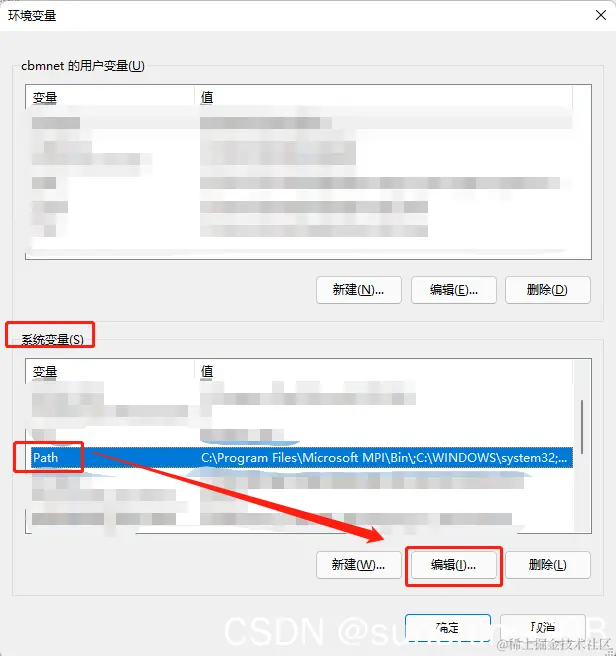 2)选中环境变量中[系统变量]的[Path]变量标签,点击下方的[编辑]按钮;