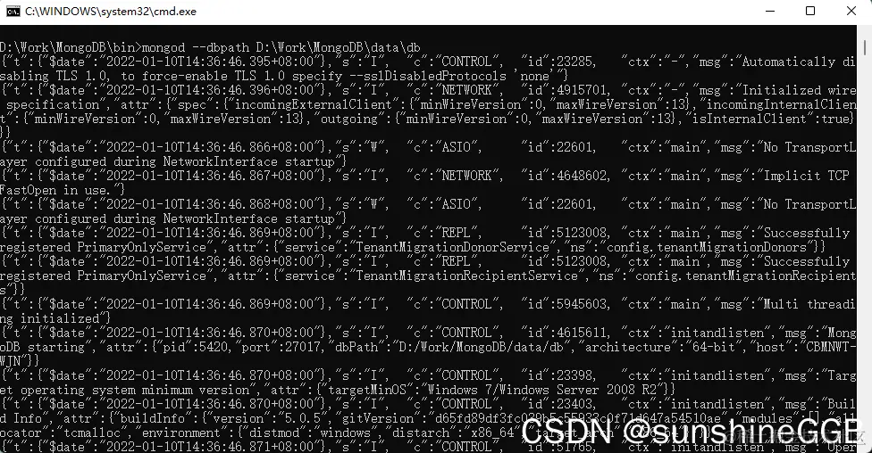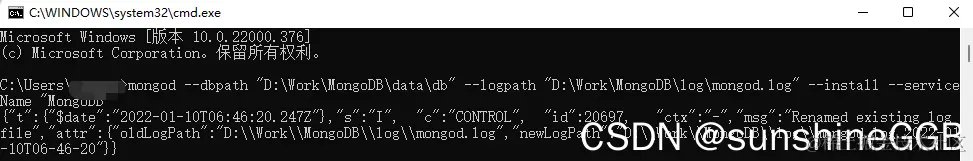 cmd输入:mongod --dbpath "D:\Work\MongoDB\data\db" --logpath "D:\Work\MongoDB\log\mongod.log" --install --serviceName "MongoDB"