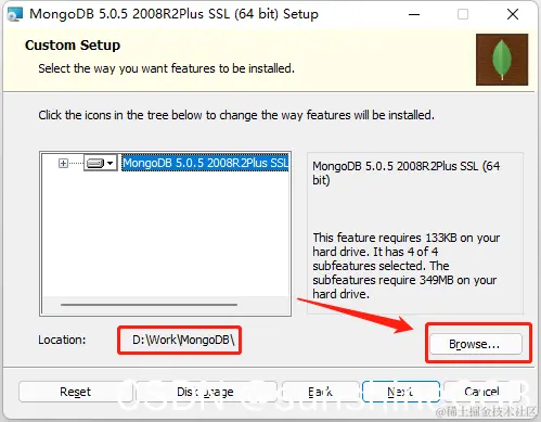 3)点击Browser按钮可选择指定安装的目录文件夹,最好事先创建一个安装MongoDB的文件夹!注意路径,若Location位置显示的是如D:\Work\,需要如上所述新建一个单独的文件夹用来作为具体的安装路径,接着点击Next进入下一步;