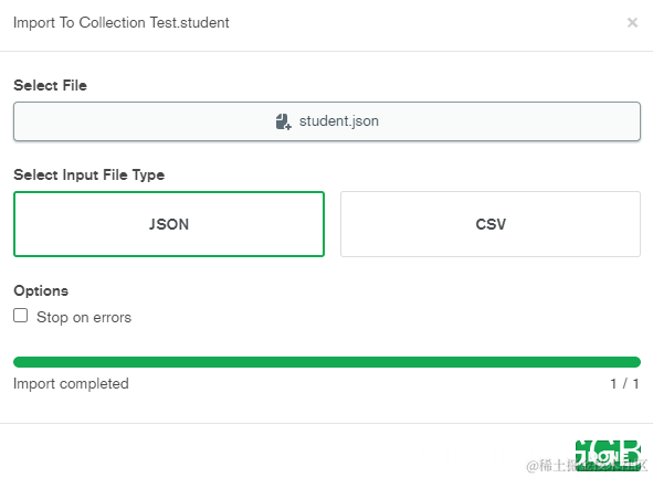 点击[Document]选项卡下的[ADD DATA]按钮导入集合(表)数据 ,导入文件格式可选JSON格式或CSV表格格式,文件里的内容格式必须符合导入文件格式的规范,即标准的JSON或CSN格式,点击[DONE]按钮导入,会提示导入成功或导入异常信息,导入成功后如上图所示;