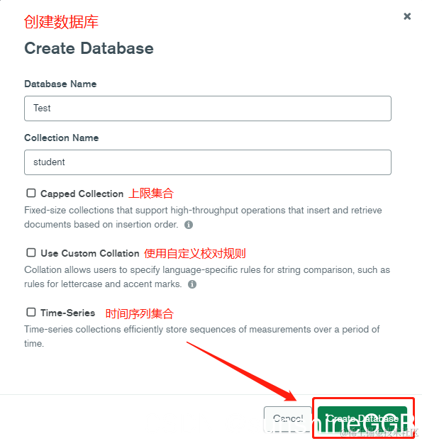 如下图所示,依次填入数据库名称、集合(表)名称,下方可以选择是否是上线集合(表)、是否使用自定义校对规则,是否按时间序列集合排序
