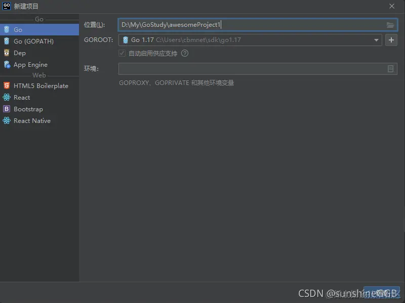 如下图:选择位置,配置好GOROOT,可以点击右面的加号下载,然后点击右下角的创建按钮