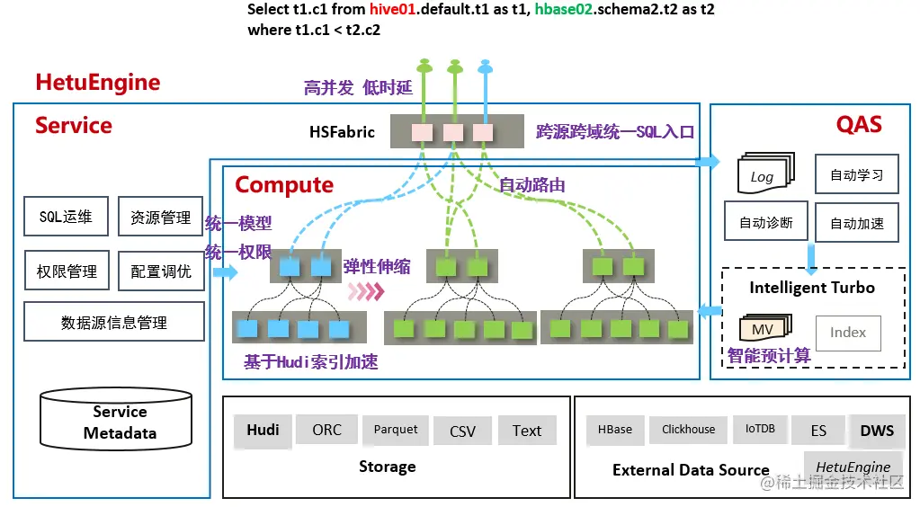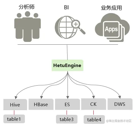在解决了“入口”的问题后,我们着手构筑起面向现代数据平台的新一代数据分析服务——HetuEngine是华为自研高性能交互式SQL分析及数据虚拟化引擎。与大数据生态无缝融合,实现海量数据秒级交互式查询;支持跨源跨域统一访问,使能数据湖内、湖间、湖仓一站式SQL融合分析。