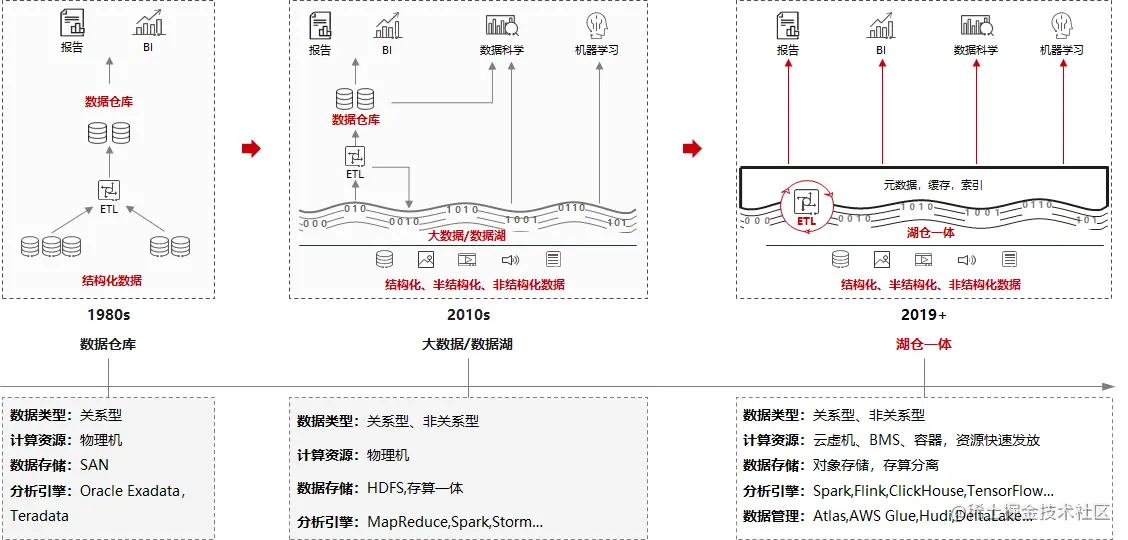 综上所述,现代数据平台的能力不断迭代,滚动向前,一方面是得益于时代背景下,各企事业单位更加重视数据的价值;另一方面数据已在各行业数字化浪潮中,发挥重要价值。大数据在近年来即解决了海量数据的存储、计算问题,还进一步深度解决了时效性差的问题,数据无法跨域融合使用的问题。业界对于数据在一个现代数据平台内流动,加速已是主流趋势,湖仓一体架构已经兼具数据湖的多样性全量数据承载和数据仓库的事务性优势,成为主流架构。