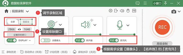 **步骤2:**进入【视频录制】的基础设置界面后,我们对录制区域、排除窗口、摄像头、音频等基础内容进行设置。