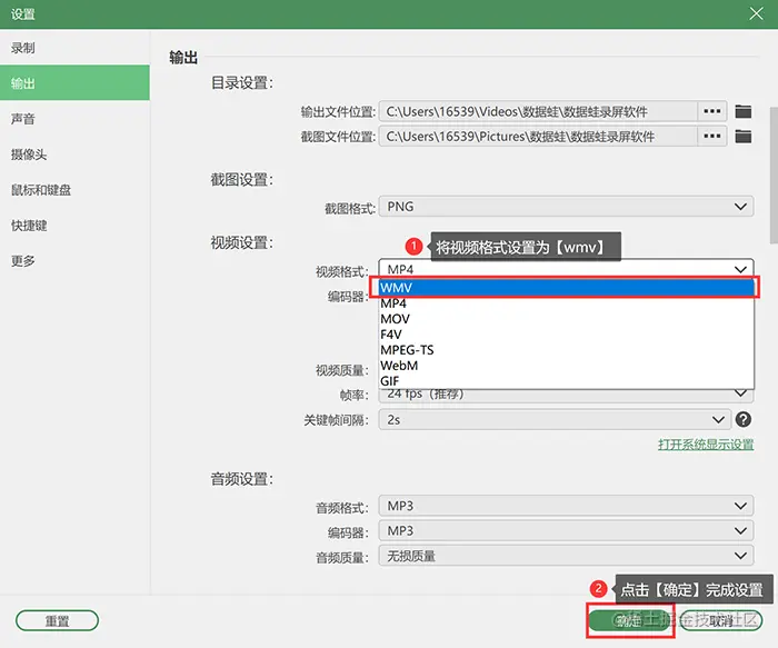 (注:小伙伴也可以在这里设置录制的音频格式、画质、帧率等其他参数)