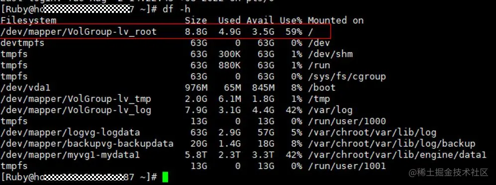使用df –h命令查看当前磁盘使用率较高的磁盘,确认当前使用率,可能存在风险的目录包括/home/Ruby/log、/home/Ruby、/home/Mike、$PGHOST、/user/local(DN);