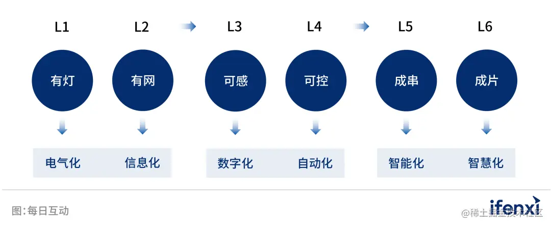 L1级是指路口设有信号灯,可进行基础交通控制。L2级是指路口信号灯有联网,交警可远程下发指令,进行单点调控。L3级是在L2基础上,通过路口安装的雷达、摄像头、地磁等设备以及互联网大数据可感知路口排队长度、车速等数字化信息。L4级则是可以通过对路口上传的数据进行分析建模,形成动态的、以数据为指导的闭环控制。L5级是在L4基础上可实现多个路口的智能协同,比如“数智绿波带”建设。L6级为实现道路智慧化管控,即基于对政府、商圈、学校等区域道路特征进行数据建模分析,可实现多路口精细化协调控制,全面提升区域道路功能性。