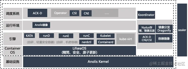 容器层:龙蜥 ACNS 提供了经过大规模生产验证的 ACK-D 集群,同时也提供了 Kata、Dragonfly、Nydus。