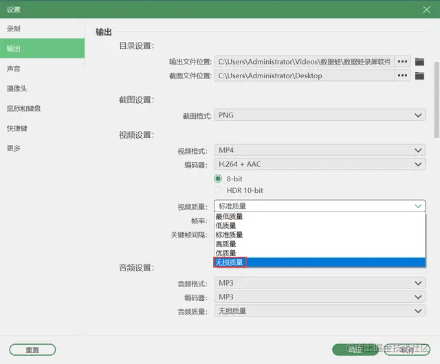软件默认的视频质量为标准质量,想要录制高清画质的录屏,可以选择“无损质量”。
