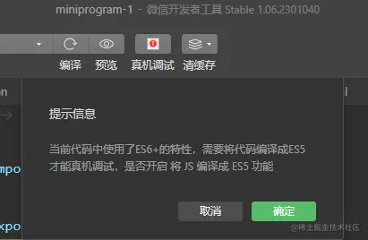 点击按钮后,如果有如下弹窗则需要修改【本地设置】,开启将JS编译成ES5: