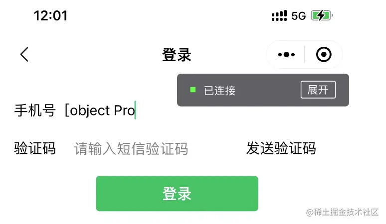 删掉async重新进行真机调试,输入手机号后立刻点击获取验证码按钮,可以成功获取到手机号并调用发送验证码按钮,如下图所示: