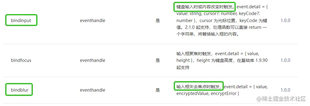 所以修改绑定事件为bindinput,这样在键盘输入时或者内容改变时就执行相应回调函数修改手机号或者验证码,这样从事件的执行时序上看来bindinput要比bindblur优先。下图为官方文档的说明: