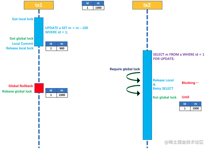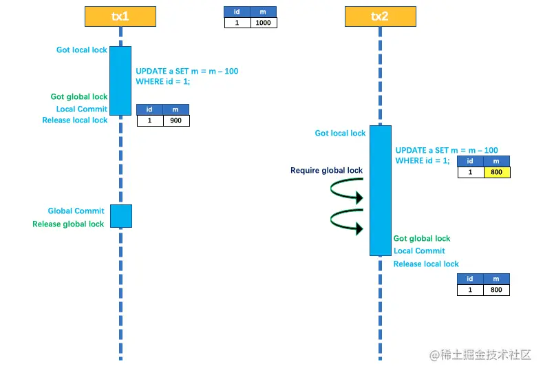 tx2后开始,开启本地事务,拿到本地锁,更新操作 m = 900 - 100 = 800。本地事务提交前,尝试拿该记录的全局锁 ,tx1 全局提交前,该记录的全局锁被 tx1 持有,tx2需要重试等待 全局锁 。