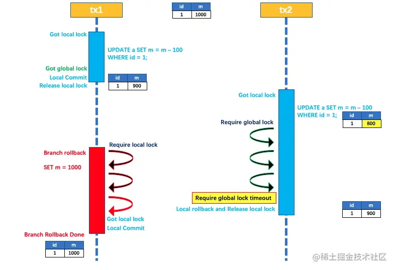 tx1先开始,开启本地事务,拿到本地锁,更新操作 m = 1000 - 100 = 900。本地事务提交前,先拿到该记录的全局锁 ,本地提交释放本地锁。