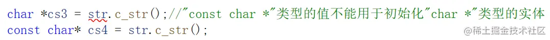 上述性质反过来不成立:程序某处需要C风格字符串可能无法直接用string对象来代替。如,不能用string对象直接初始化指向字符的指针,需用c_str()函数处理string对象,返回指针类型是const char*。(这块返回const修饰的类型,书上说是确保我们不会改变字符数组的内容,暂不知道限制这个有何意义,防止外人改变内容?)