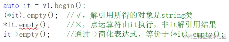 - 解引用符可获得迭代器所指的对象,如果该对象类型恰好是类,就能用成员访问符进一步访问。