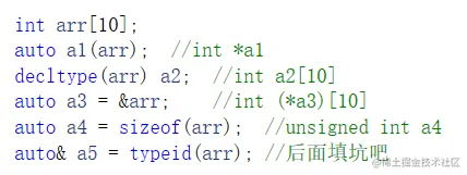 - ps:decltype、&数组名、sizeof、typeid不会发生前面auto的类型转换。