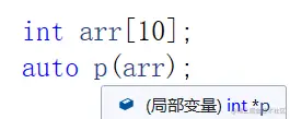 编译器一般会把数组转换成指针。在很多用到数组名字的地方,编译器会自动将其替换成一个指向数组首元素的指针。因此当使用数组作为一个auto变量的初始值时,推断得到的类型是指针。如图:
