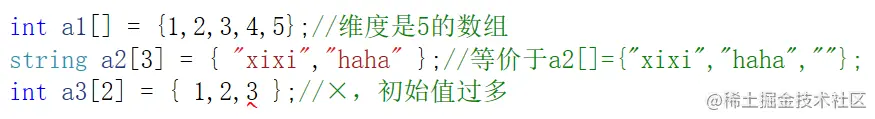- 使用列表初始化时,可忽略数组维度,编译器会根据初始值的数量计算并推测出来。