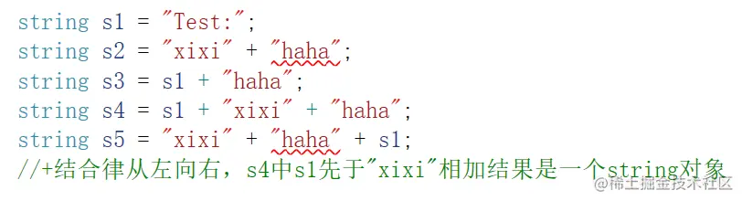+:当string对象和字符字面值及字符串字面值混在一条语句中使用时,必须确保每个+两侧的运算对象至少有一个是string。