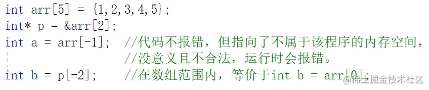 - 与vector和string不同,内置的下标运算符所用的索引值不是无符号类型,即可处理负值。(此处我目前的理解:1.指针有指向内存中的对象的功能,且能通过+、-等操作将指向往前往后移动,对指针使用下标运算符p[-1]是合法的,等价于p-1的操作,即向后挪一位。数组会被编译器自动转换成指向首元素的指针,也具备这种特性。2.指针指向数组时,给指针下标输入正、负值其本质是控制指针向前、向后挪位。3.为何上条强调数组的下标size_t是无符号类型?是因为数组名是指向数组首元素的指针且数组是不能赋值的,数组名即可看作是常量指针,其指向初始化后是无法变动的,所以数组下标为负会指向一个不属于该程序的内存地址,这是不合法的但是编译器不会报错;而指针可指向数组中的元素,对指针下标输入正、负值可使指针在同一数组的元素中前后移动,这是合法的。因此认为数组下标是无符号类型只是避免出现不必要的错误。)
