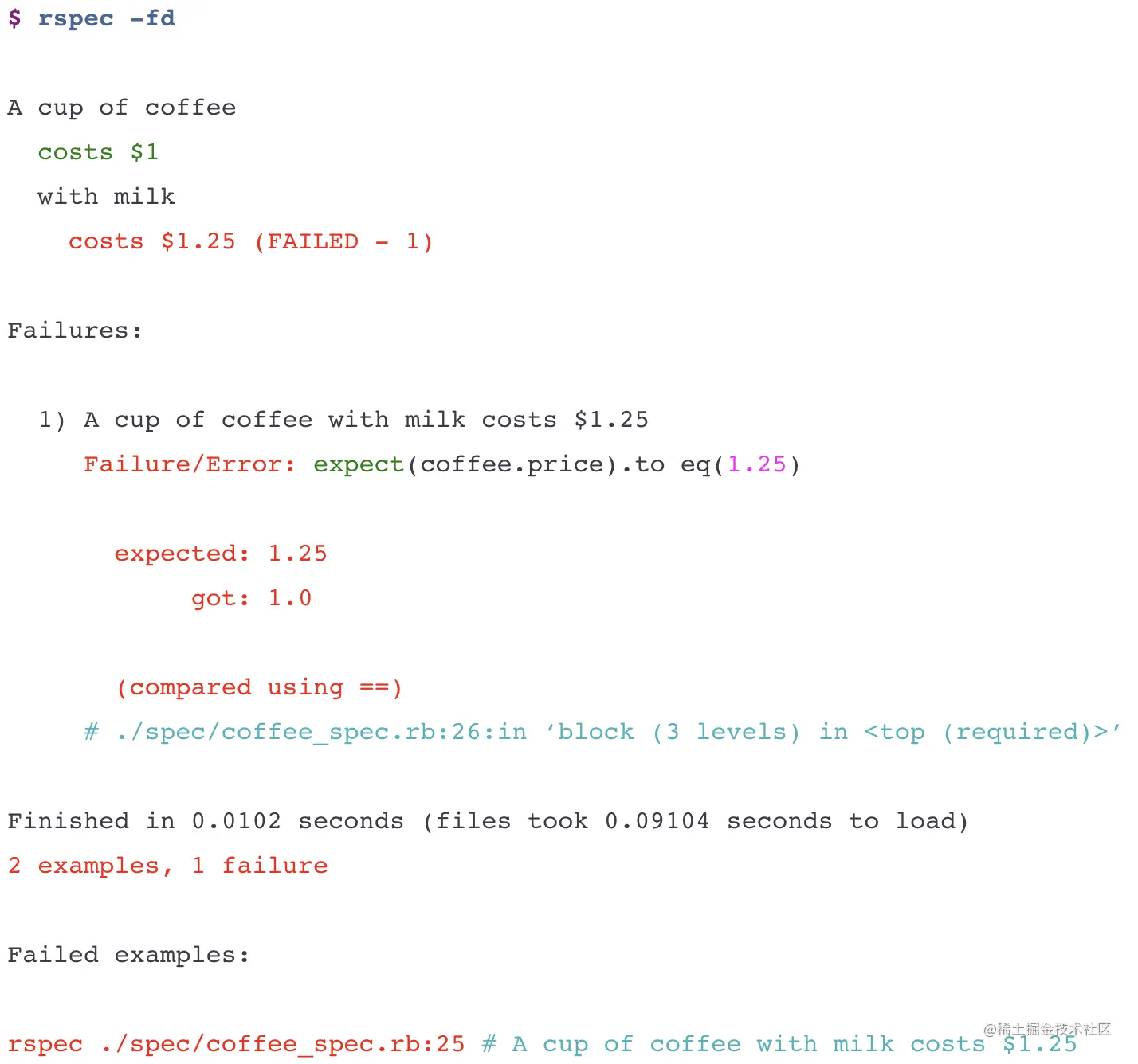 如果想进一步句法高亮的话,可以使用CodeRay gem。RSpec在运行时,会自动搜索CodeRay是否安装,如果安装会自动使用。注意看expect方法和1.25的高亮。通常,在复杂的spec定义的时候,使用CodeRay高亮输出结果会对分析很有帮助。