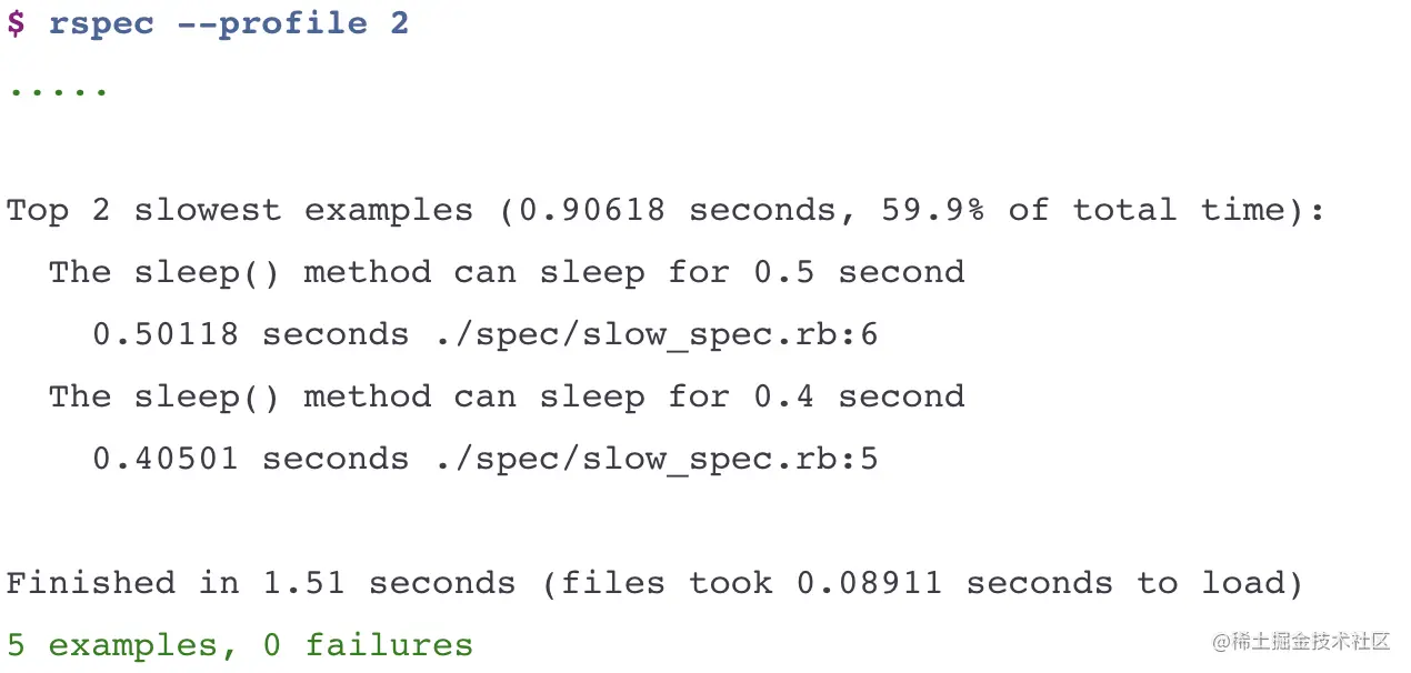 运行rspec --profile 2即可输出运行最慢的2个spec。