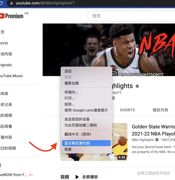 假设需要找到NBA Highlights频道的频道ID,我们先进入该频道主页,在右键菜单里点击进入“显示网页源代码”: