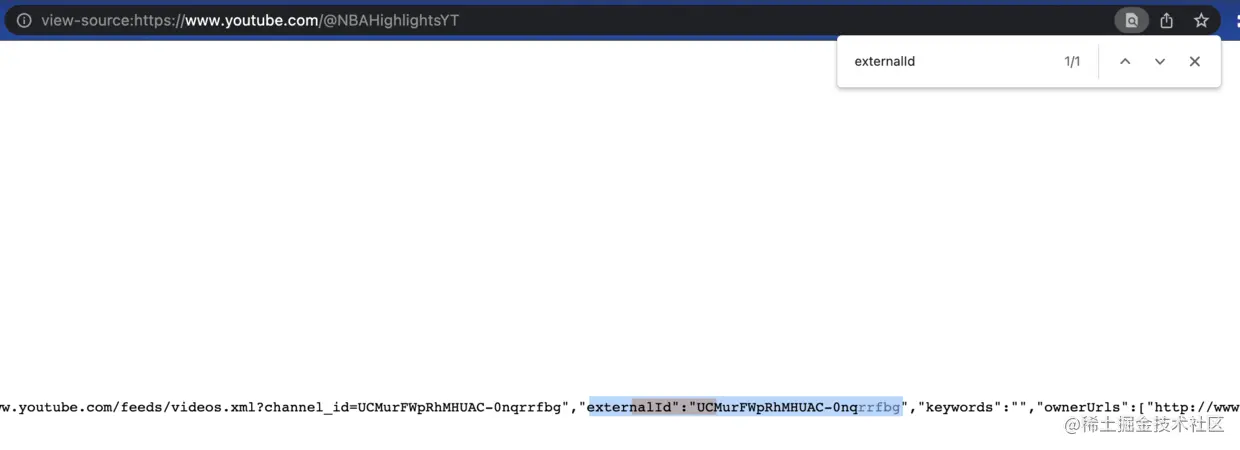 在网页源代码里搜索externalId,即可看到该参数对应的一串编码,这就是频道ID:
