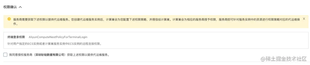 此外,新版本还将提供代运维服务,借助阿里云计算巣提供的代运维能力,通过标准化授权流程,在用户创建服务实例时,帮助用户对该服务实例下的阿里云资源进行代运维,解决支持获取访问实例日志的权限,提升故障排查定位效率。